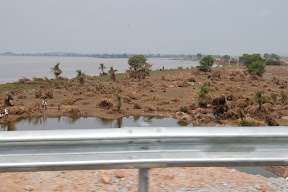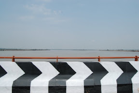 Nach ein paar Pausen und Frühstück kamen wir an einen Checkpoint an dem sich jeder Hilfstrupp der in das Gebiet geht registrieren musste und angeben musste wo wer mit was helfen will. Dies war schnell erledigt und nun fuhren wir in das Gebiet das von den Fluten so betroffen war. Wir fuhren über eine Brücke über den Fluss Krishna. Schon hier war zu sehen wie weit das Wasser über die Ufer getreten war. In den Bäumen hingen Klamotten die durch die Fluten angeschwemmt worden waren.